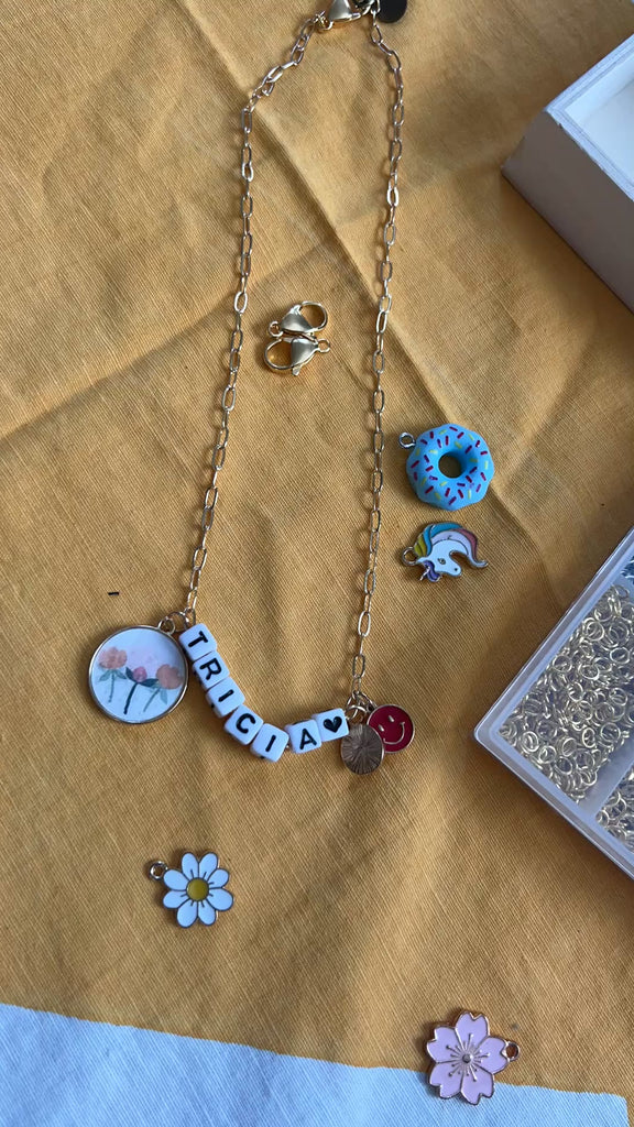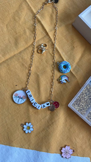 Customize your necklace will be the perfect addition to your style!  Handcrafted with unique pieces and letter beads, this piece adds a touch of whimsy to any outfit.  Uniquely made in California.